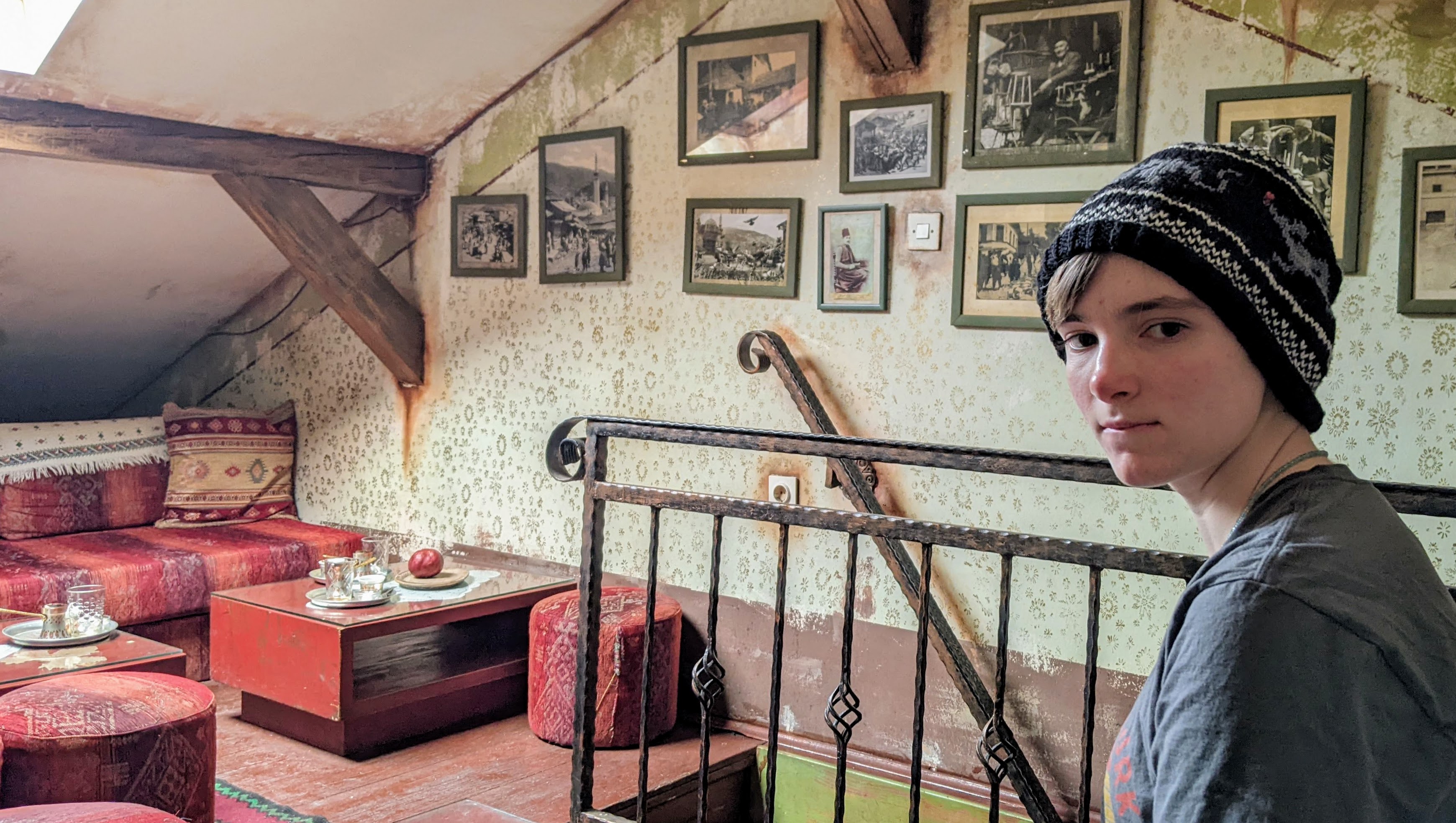 While the boys skiied, I wandered the town. I found a tea house not far from our lodging and dragged Kathleen to it. Čajdžnica Džirlo has small cushioned stools and low tables outside, tiny cafe tables inside, a sea green cabinet filled with tea pots spanning an entire wall, and a tiny kitchen area that barely contains one person. The hot drinks are prepared on a two-ring gas burner and the wash up sink probably couldn’t fit a tea kettle into it. Past the prep area and up the winding stairs, the attic room is furnished with a low divan stretched along one wall, ottomans and kilims arranged all around. Apart from the hosts, the real magic of the place is the atmosphere – which happens to be entirely faux painted, from the patina on the railings to the ‘discoloration’ of the wall paper. Whoever decorated the space did it well.